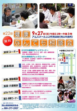 第22回健康何でも相談会が、9月27日(日)11:00~15:00アムスメール上之町商店街(岡山市表町)で行われます。