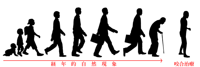 人間の歯も長年使ったり歯を抜くことで、噛み合わせの上下の間隔が狭まり、下の顎は後方へ引け、頭は前に傾き、前傾姿勢になりますが、これも、年のせいで片付けられています。