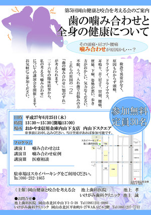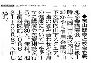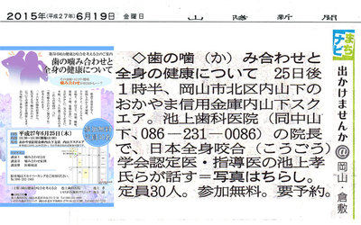 2015年6月25日(木) 13:30~15:30 おかやま信用金庫 内山下支店 内山下スクエアにて 第5回目、医科歯科連携「歯の噛み合わせと全身の健康について」を行います。 参加費は無料なので、お気軽にどうぞ。(お電話にて予約していただけると幸いです) 駐車場は、スカイパーキングをお使いください。 11日(木)の山陽新聞にも掲載されています。