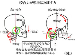 人間は二本足で立ち、一番上に重い頭があり、噛み合わせが低くなると下の顎は後ろへ下がり、重い頭は前に傾いてバランスを取る為に猫背になっているのです。
